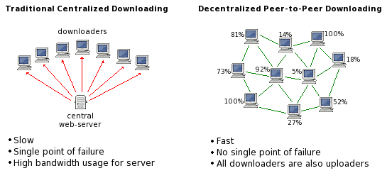 However, in a peer-to-peer system, there is no central authority, and hence if even one of the peers in the network goes out of the race, you still have more peers to download from. Plus, it is not subject to the idealistic standards of a central system, hence it is not prone to censorship.